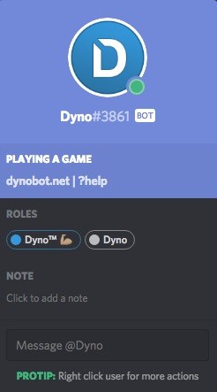 Dyno bot is useful for releasing custom notification just like if someone joins, leaves or is banned from the server. Assigning roles to the server and user is also performed by it easily.as it comes with cleverbot integration it can be used to post over watched stats, Google results and can stream music from YouTube.